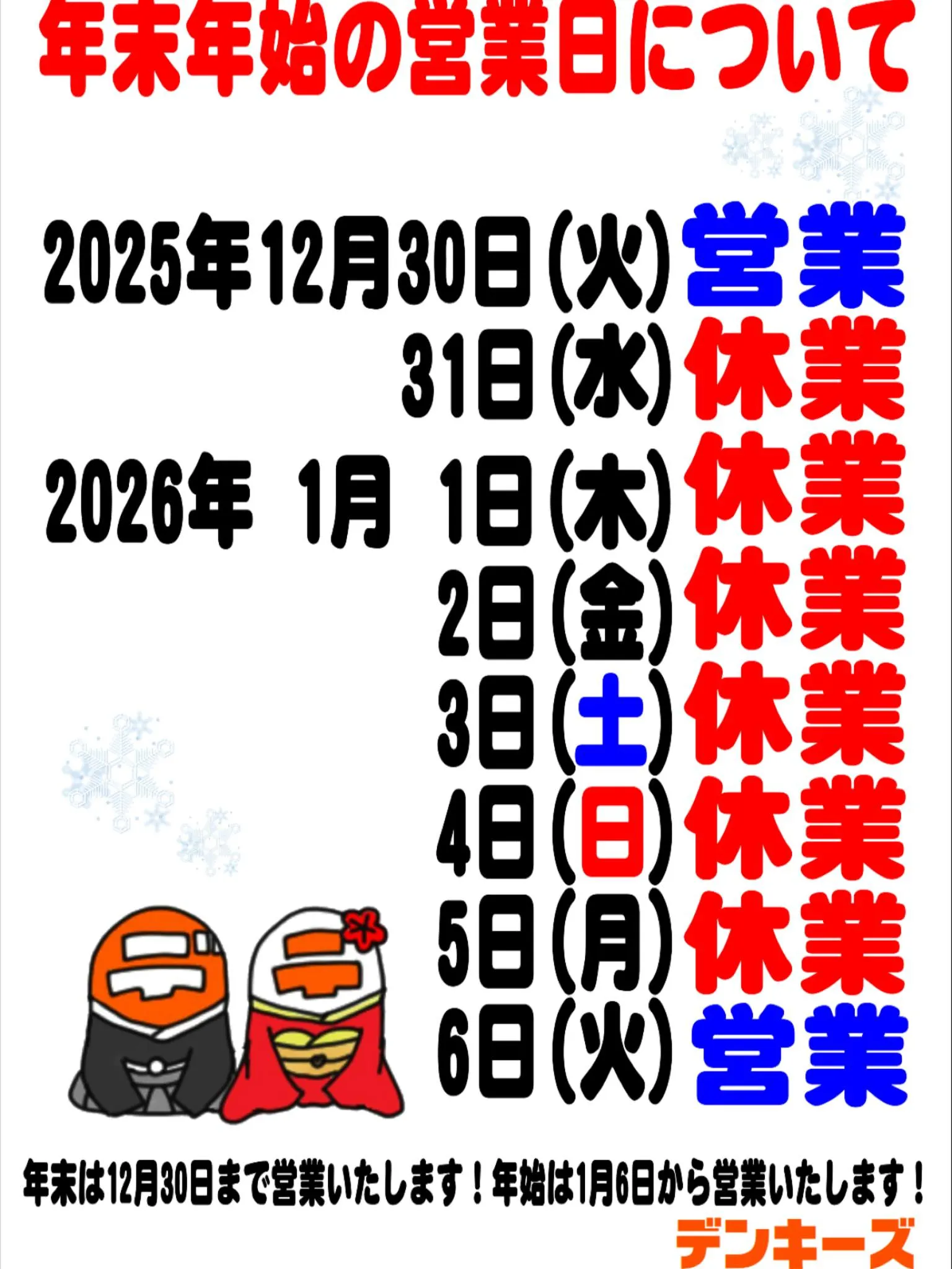 年始の営業は、令和8年1月6日(火)からとなります。